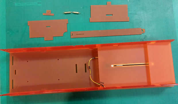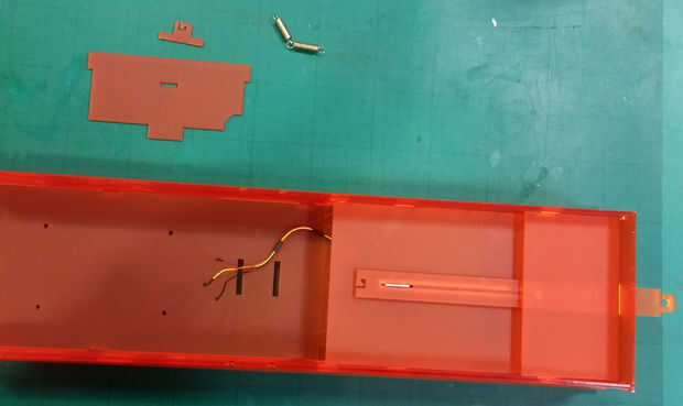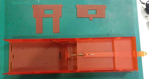 En primer lugar, ranura de la pieza final de la caja de RoboTug en su lugar. Enganche el cursor en el potenciómetro lineal y a través de la pieza final, según las notas en el cuadro uno. Pegue la pieza de extremo en el lugar pero no el regulador.