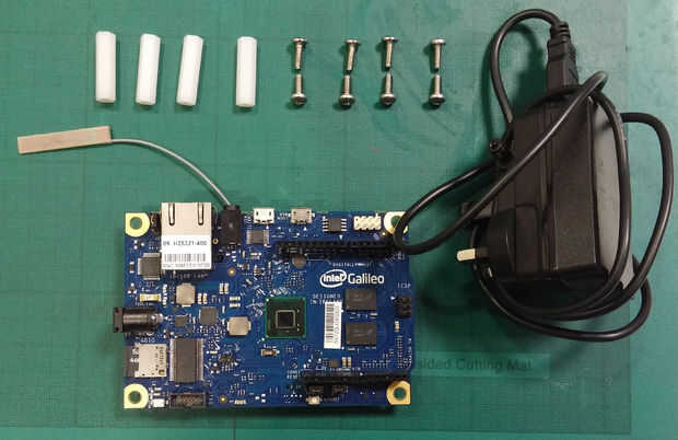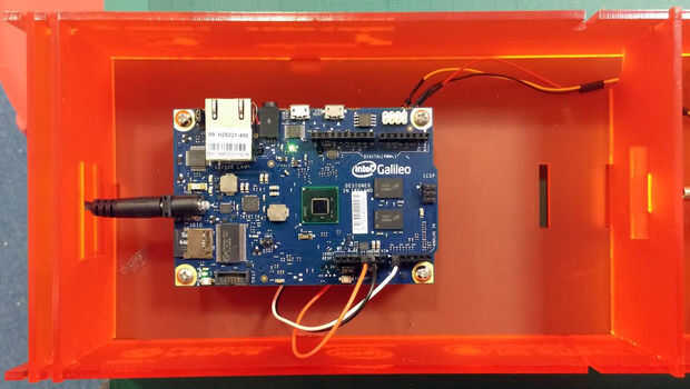 Los espaciadores de montaje en la parte inferior de la carcasa del RoboTug del tornillo, luego Galileo en el tornillo en la parte superior, como se ve en la imagen dos.