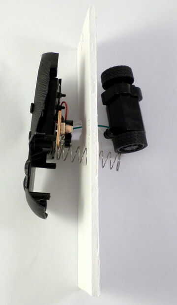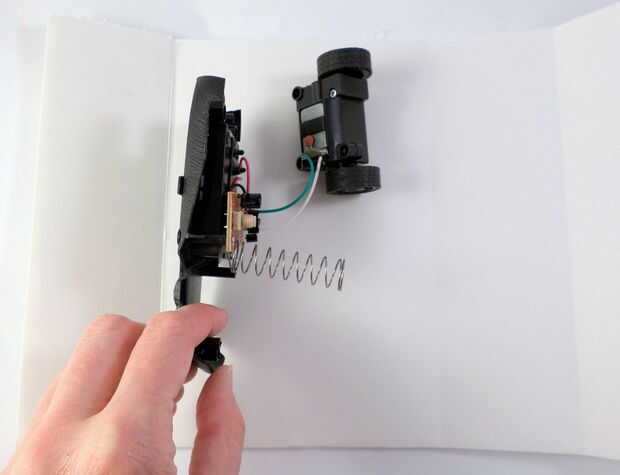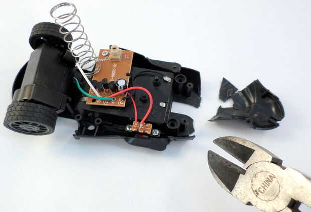 Utilizar algunos cortadores de alambre robusto para cortar el ratón RC desmontado por lo que es no más ancha que 5,68 cm (la longitud no importa, pero usted puede cortar para hacer el peso más ligero del bot de enredadera). Asegúrese de no cortar los tres lugares donde los tornillos fijación la base a la cáscara, o cortar el interruptor.