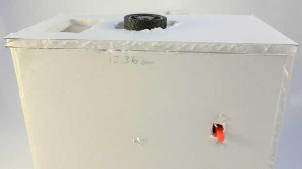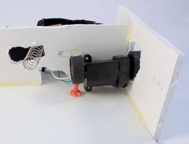 No olvides también corte un orificio de 2 cm x 3 cm en la pieza de Junta de espuma superior (el 6,68 13,36 cm x uno) para que los faros que pasar para que ellos puedan alcanzar la cabeza.
