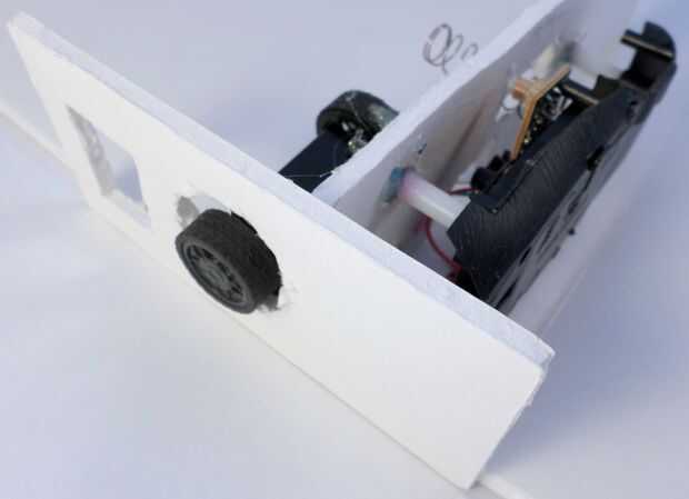 Una vez que estés feliz con Dónde está la rueda (debe ser centrada en el agujero en la parte superior y que se pega hacia fuera 1 cm sobre la parte superior), utiliza un montón de pegamento caliente para fijar las ruedas a la pieza de Junta de espuma de 19,04 cm x 5.68 junto a él. Ver las fotos.