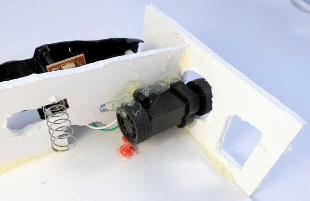 Cortar una pieza de tablero de la espuma es 6,68 cm x 13,36. Esta pieza de Junta de espuma irá la parte superior del torso del bot de enredadera. En el centro, cortar un círculo que es el mismo diámetro que las ruedas de ratón RC. Caliente pegar esta pieza a la parte superior del marco rectangular, como se muestra en las fotos.