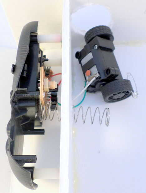 Para detener las ruedas girando alrededor (que podría hacer la cabeza girar 360 grados en vez de girar a izquierda/derecha), coloque un alfiler en la rueda inferior (dentro del torso) y crear un bloqueador de un alfiler. Ver las fotos para más detalles. Básicamente, empuja un perno de seguridad a través de la rueda inferior y luego caliente pegamento él en con porciones de pegamento (pero sólo en la superficie de la rueda). Luego empuje un alfiler a través de la Junta de espuma debajo de la rueda. El alfiler en lugar de pegamento caliente.