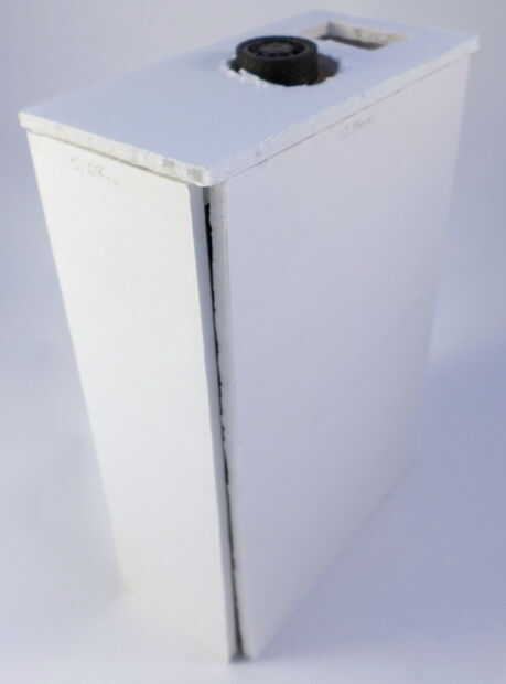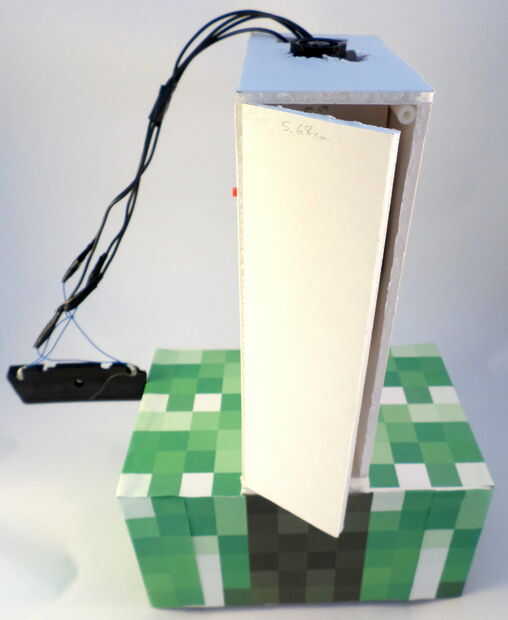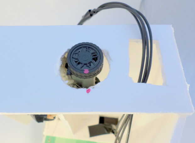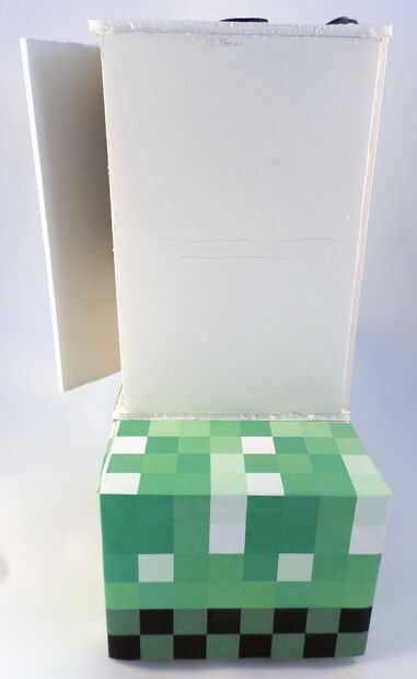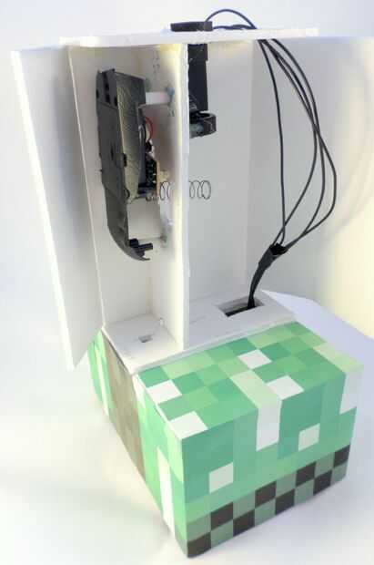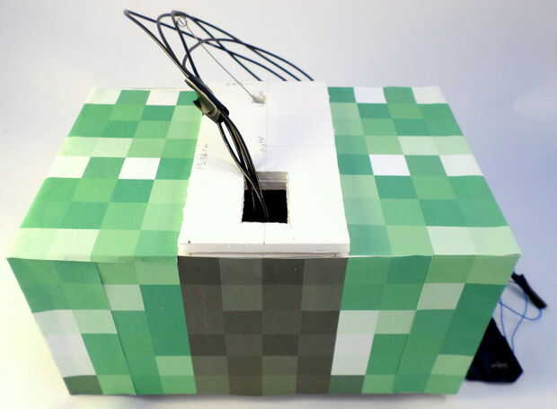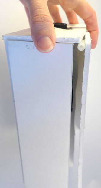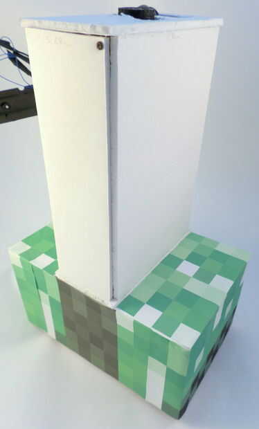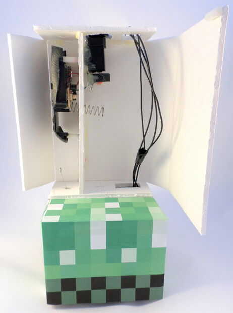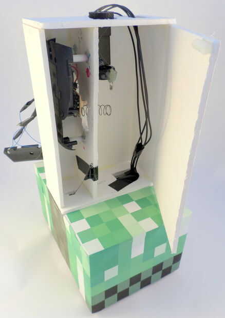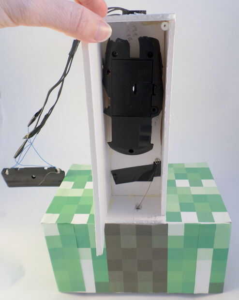 Ahora que todo en el torso en su lugar, es tiempo para cerrar bien. Pero en primer lugar, usted querrá hacerlo fácil para que usted pueda acceder a la batería de RC del ratón para que pueda llegar a él si usted necesita poner en pilas. Para hacer esto, harás la aleta accesible a través de destornillar un solo tornillo. Pegamento caliente un cilindro plástico en la parte superior de la aleta ancha rectangular que estará en la parte frontal del torso. Ver las fotos para más detalles. Cuando esté listo para cerrar esta aleta, utilice el tornillo cuarto que tomó el coche RC (en el paso 10).