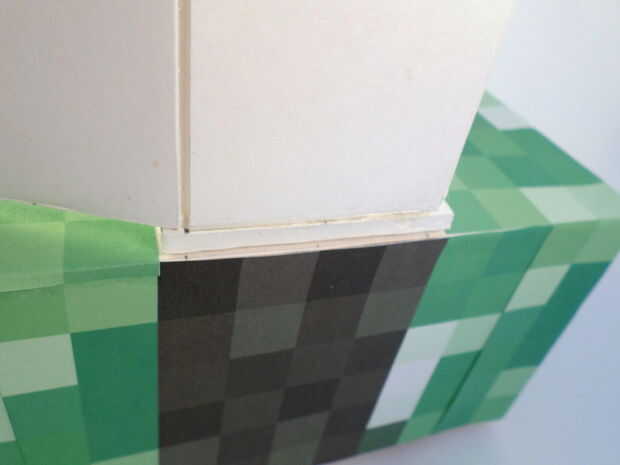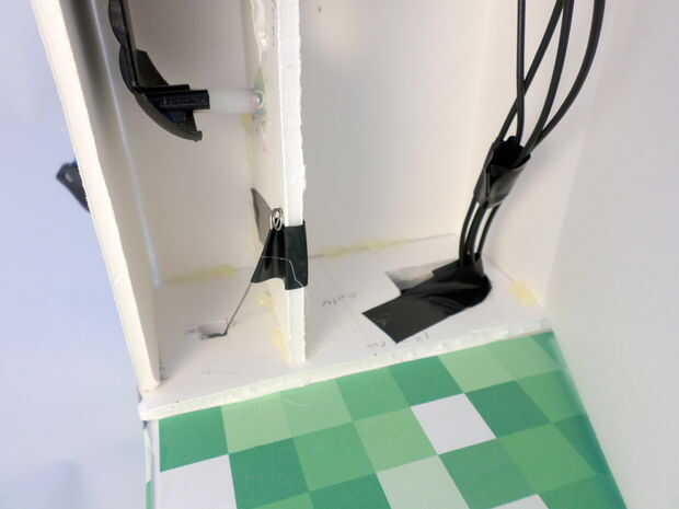 Colocar el torso sobre el pedazo que a pegado en la parte superior de los pies (véase los cuadros). Recorren los faros el torso, a través del orificio hecho en la pieza de Junta de espuma superior. Luego pegue las aletas cerradas alrededor del torso, uno a la vez. No olvide pegar la tapa con el tornillo en él para que pueda acceder a la batería! También pegar el torso a la pieza encima de los pies.