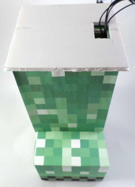 Tomar uno de los cm 13,36 por casillas 13,36 cm del tablero de la espuma hecho anteriormente en este paso. Imprimir el PDF en este paso, córtelo hacia fuera y pegamento de la piel a la Plaza de la Junta de espuma utilizando un pegamento de la escuela de blanco y pincel de espuma. Colocar esta pieza en la parte superior el torso del bot (con la piel hacia abajo), centrándolo en el torso, y, una vez que hayas averiguado el posicionamiento, corte un agujero en el tablero de la espuma para los faros al pasar por la enredadera. Hacer no corte un agujero para la rueda! La rueda será directamente pegar en la parte inferior de esta pieza, pero no absolutamente todavía. Ver las fotos para más detalles.