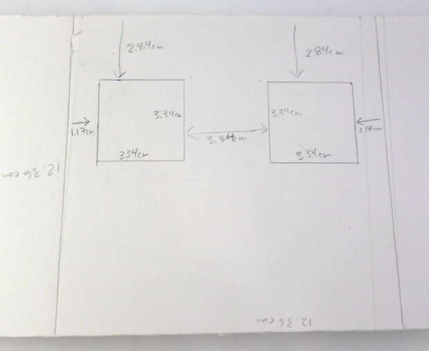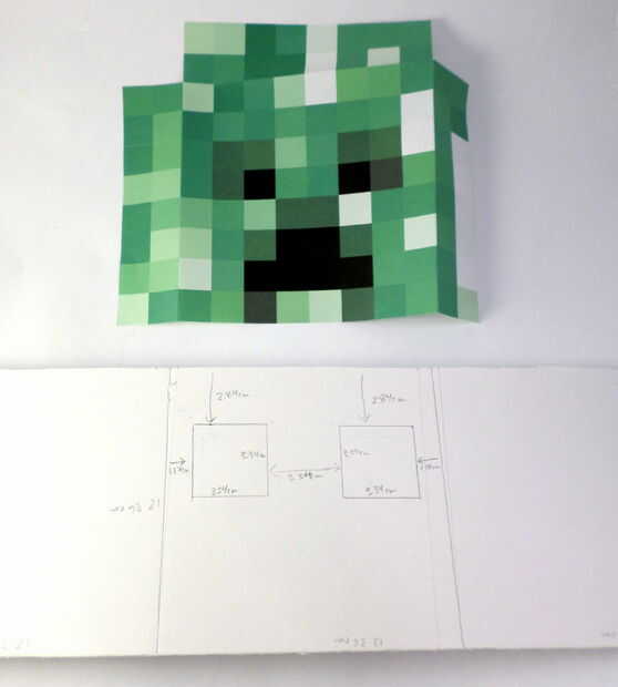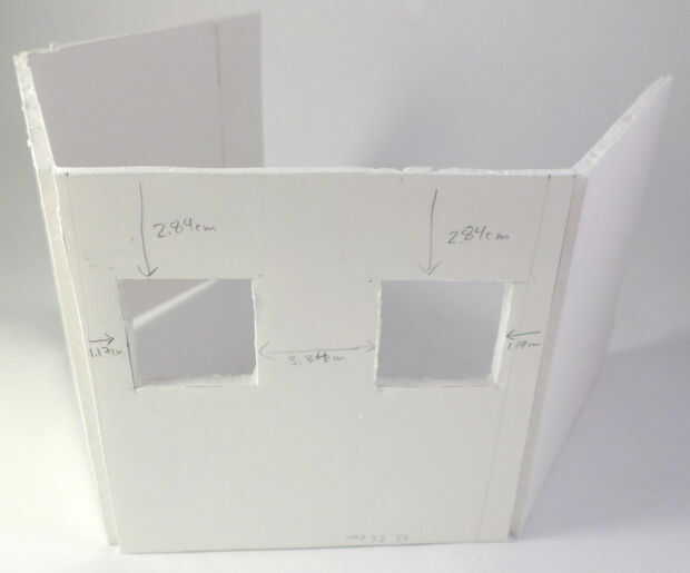 En uno de los 12,36 cm segmentos 12,36 cm de los lados de la cabeza (no importa cual segmento utilizas), marcar donde quieres cortar los ojos. (Esto es para que las luces del coche RC pueden brillar a través de los ojos). Los agujeros del ojo debe ser cm 3,34 3,34 cm, espaciadas 3,34 cm de separación, 1,17 cm hacia el interior de los bordes derecho izquierdo y 2,84 cm hacia abajo desde la parte superior de la pieza de Junta de espuma. Ver las fotos para más detalles. Una vez que ha medido y dibujado donde hacer los agujeros del ojo, recorto con la navaja.