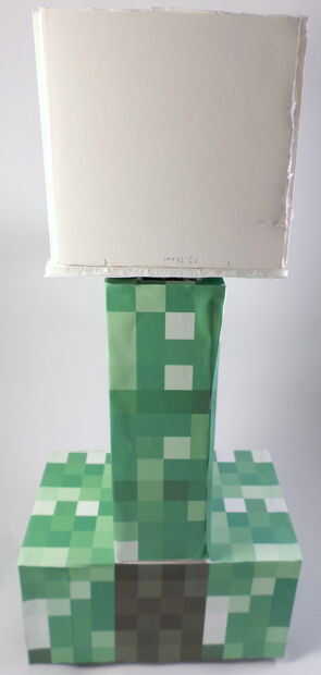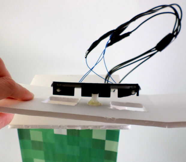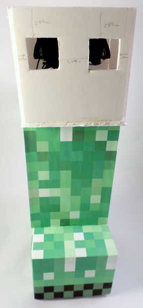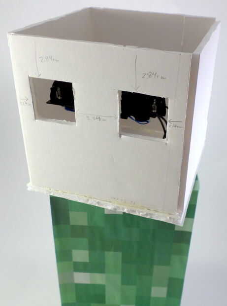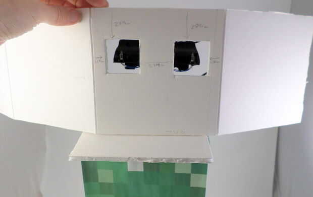 Cierre con cuidado en los lados de la cabeza para que forman cabeza cúbica de la enredadera (puede cinta cerrado antes de pegarlas en su lugar). Asegúrese de que los faros están mirando hacia el frente de la enredadera. Pegamento caliente los lados de la cabeza en su lugar a la pieza principal de fondo.