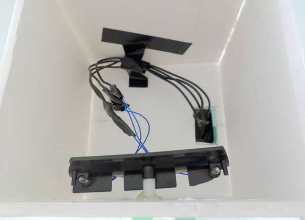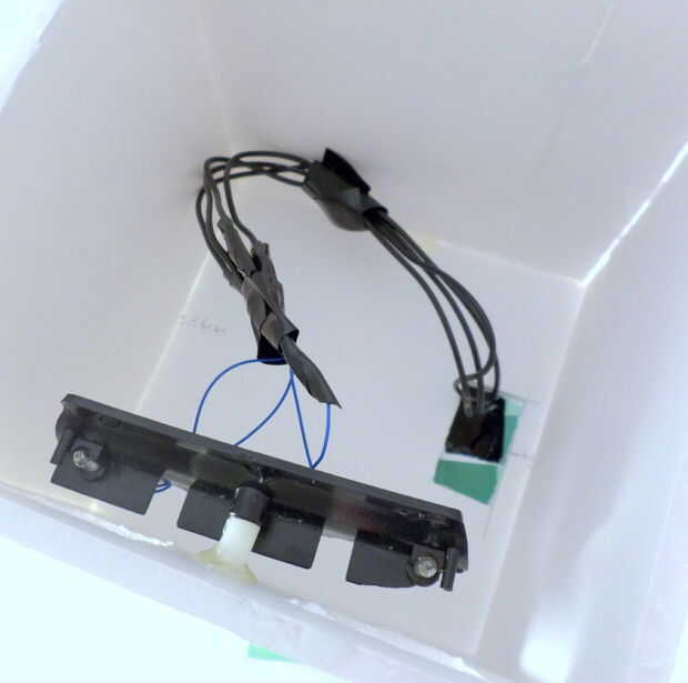 Justo entre los ojos del bot de enredadera, en el interior de la cabeza, marque con un lápiz donde poner los faros. A fijar los faros por el tornillo que está en medio de ellos (que era originalmente fijación de los faros a la cáscara del coche RC). Cuidadosamente Mantenga los faros hasta los agujeros del ojo para ver donde quieres instalar de manera que brillan en los ojos.