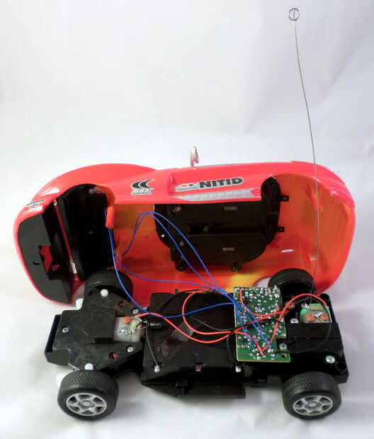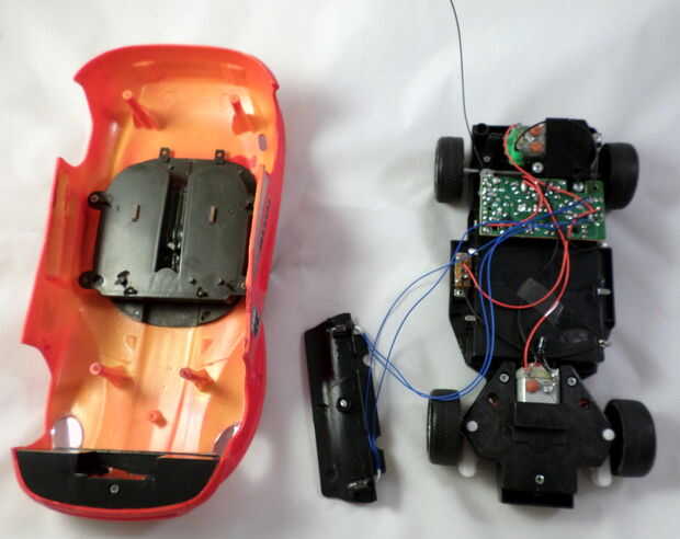 Coger el coche RC lindo y dale la vuelta por lo que usted está buscando en su parte inferior. Retire los cuatro tornillos que sujetan la carcasa superior del coche en la estructura base del coche (donde las ruedas, motor, batería y circuitos son). Dos de estos tornillos están entre las ruedas traseras, y dos de estos tornillos están entre las ruedas delanteras – ver fotos para detalles. Asegúrese que los tornillos, los necesitarás más adelante.