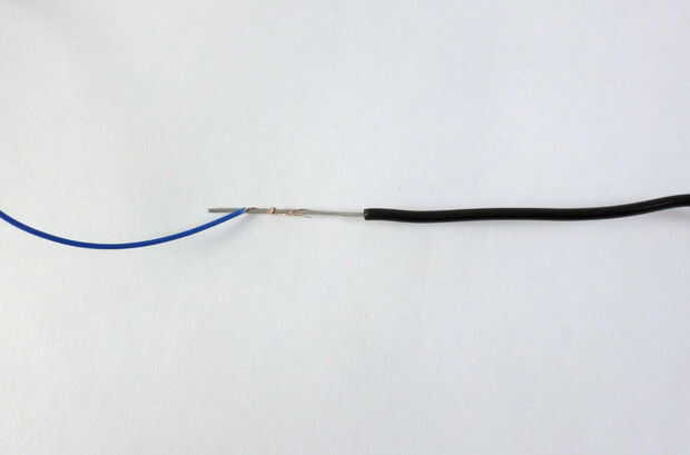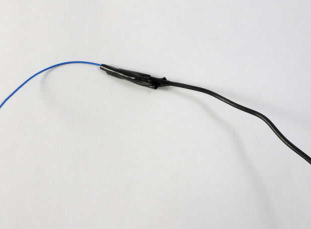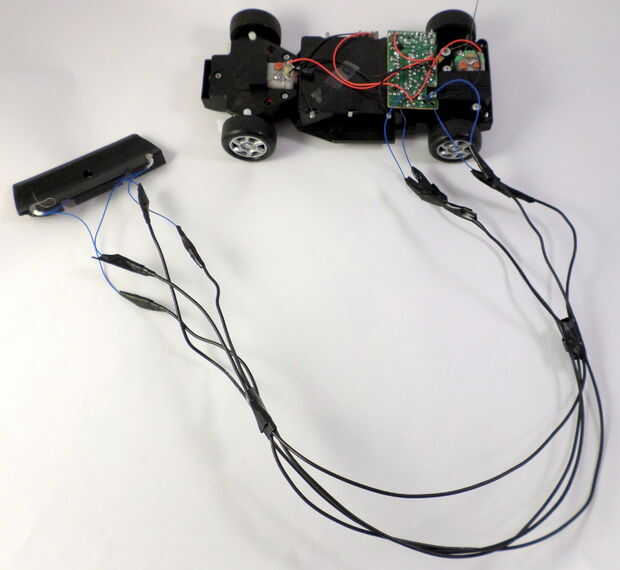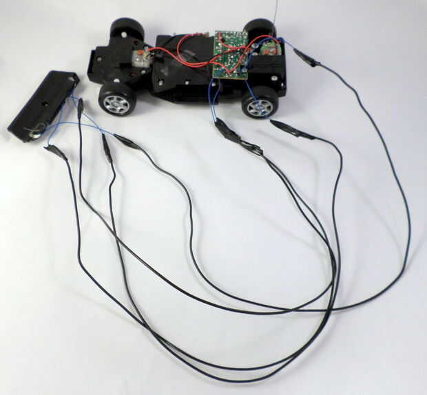 Cortar uno de los cuatro cables azules que fijan la base del coche RC a sus faros. Cuidadosamente la tira unos 2 cm de aislamiento de los extremos del cable azul. (Es muy fácil soltar el cable desde la placa de circuito en este momento, así que ten cuidado! Esto es cuando algunos de soldadura puede ser útil). Tuerza un extremo del cable pelado azul junto a un extremo de un alambre largo 55 cm que usted preparado y luego tuerza los otros cabos sueltos. Usted debe han ahora efectivamente alargado el cable azul de unos 55 cm. envolver alguna cinta aislante alrededor de donde usted trenzado de los alambres para mantenerlas Unidas.