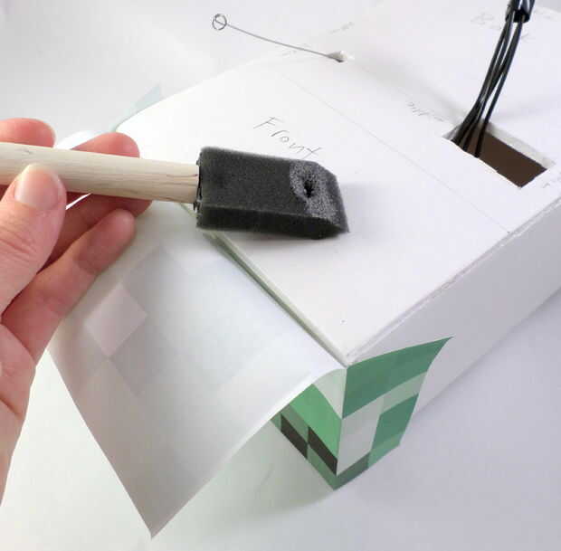 Imprimir el PDF en este paso, recorto, doblarlas y pegar en los pies. Utilice un cepillo de espuma (y pegamento blanco escolar) para suavizar el pegamento en el tablero de la espuma justo antes de colocar el papel. Utilizar las imágenes en este paso para averiguar cómo doblar y orientar el papel de los pies. (Tenga en cuenta que las direcciones en los archivos PDF son desde la perspectiva de la bot de enredadera). Asegúrese de que pones patas delanteras de la enredadera (con el patrón de tablero de ajedrez en la parte inferior) en la parte delantera del coche.