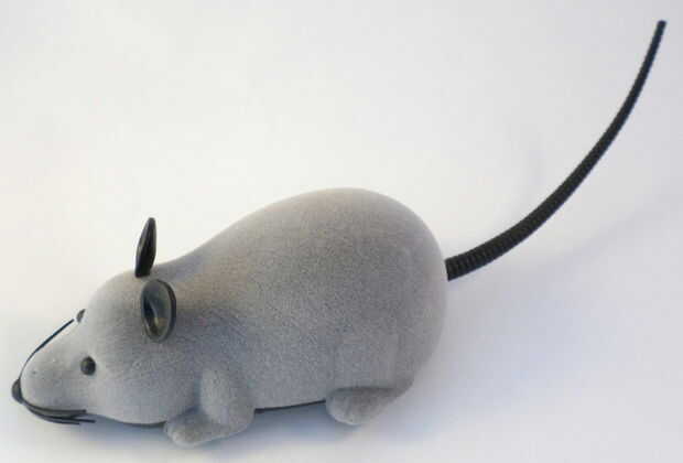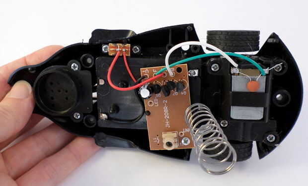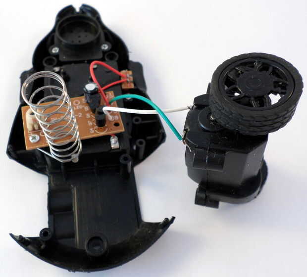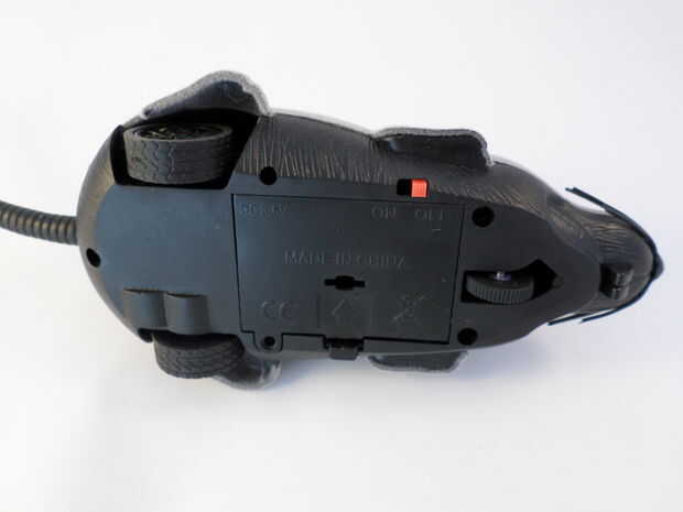 Tomar el lindo ratón RC y dale la vuelta por lo que usted está buscando en su parte inferior. Retire los tres tornillos que sostienen la carcasa superior del mouse sobre su armazón base (donde las ruedas, motor, batería y circuitos son). Dos de estos tornillos en ambos lados de la rueda delantera y el otro tornillo está justo debajo de la base de la cola-ver las fotos para más detalles. (No se necesita guardar los tornillos).