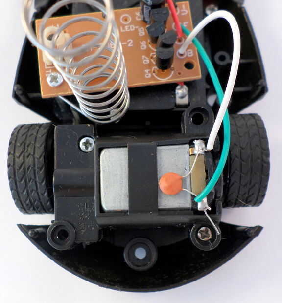 Levante con cuidado la cáscara de la base del ratón, asegurándose de no dañar la antena espiral. A continuación, retire con cuidado los dos tornillos que sujetan el motor (conectado a las ruedas traseras) a la estructura base. Tenga en cuenta que hay cuatro tornillos alrededor del motor – dos de estos sujetan los engranajes en el motor, y no quieren meterse con eso. Mira las fotos para que dos tornillos (de los cuatro) que desea eliminar.