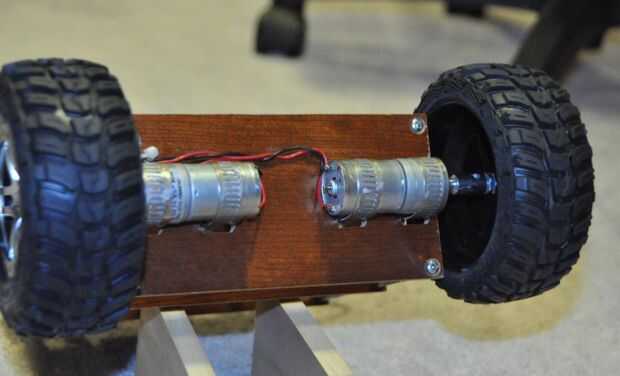 Mi intención con el chasis del robot era mantenerlo simple y utilice el material que estaba disponible para mí. Eso condujo a un diseño de niveles, usando 1/4" madera contrachapada de mi trozo de madera aluminio y cuadro de enfrentamiento. Jugaba con un número de métodos para fijar una ronda motor a una pieza plana de madera contrachapada, pero terminó en el uso de 2 abrazaderas por motor, a través de ranuras en la madera contrachapada.