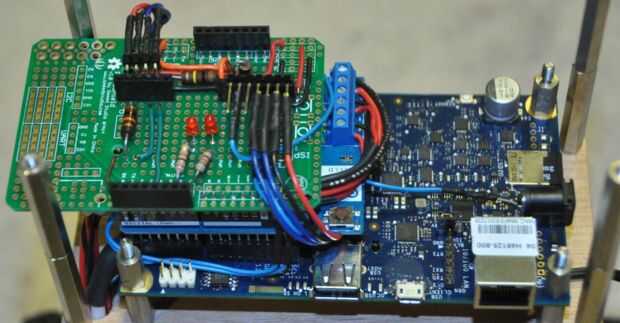Las conexiones eléctricas entre Galileo y el escudo del motor se logran colocando el escudo del motor al conector de Galileo Arduino, con el escudo de proto apilado en la parte superior el escudo del motor.