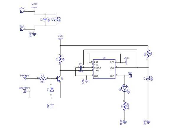 Para un proyecto necesito unos botones robustos. No pude encontrar botones de cierto tamaño, así que decidí crear mi propio. Cuando se presione o toque la parte frontal del botón, obtendrá un impulso de + - 1 seg. El piezoeléctrico se genera un pequeño impulso, que es amplificado por un transistor. Un Ne555 en modo monoestable me da un impulso de 1 seg.