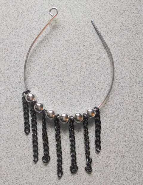 5. Deslice una cadena y una bola en el aro alternando hasta tener 7 cadenas y seis bolas de cada aro. No te preocupes si el cable consigue un poco deformado, que usted puede cambiar la forma en el vaso de chupito si es necesario.