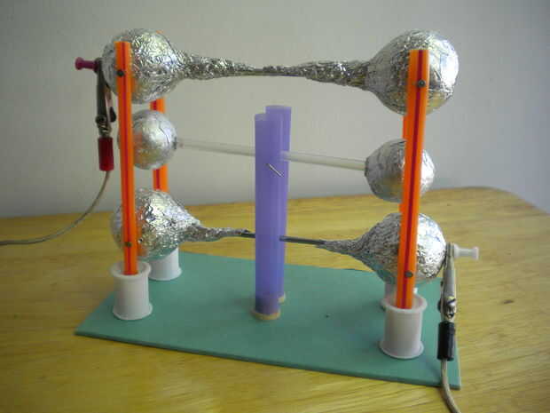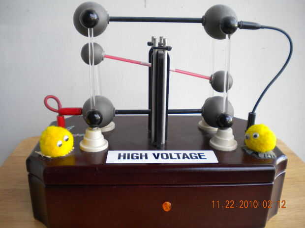 Usé las esferas conductoras para traslados de cargas eléctricas entre los polos de una fuente DC (HV) de alta tensión. Esta Asamblea de traslado se hizo de dos, cubiertas de papel esferas Unidas por un tubo de plástico no conductor. La Asamblea fue intercalada entre dos electrodos en forma de la pesa de gimnasia inmóvil. Cuando la pesa superior fue a tierra con respecto a la pesa menor carga negativa, el transbordador empezó a rebotar entre los polos de alto voltaje con un ruido oiga como cargos fueron transferidos desde el más bajo al electrodo superior. Este movimiento oscilante completó el circuito de alto voltaje.