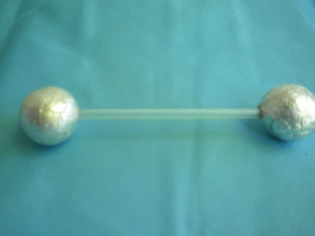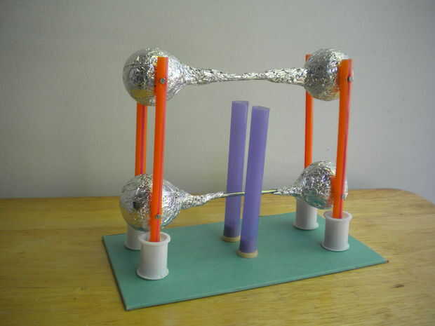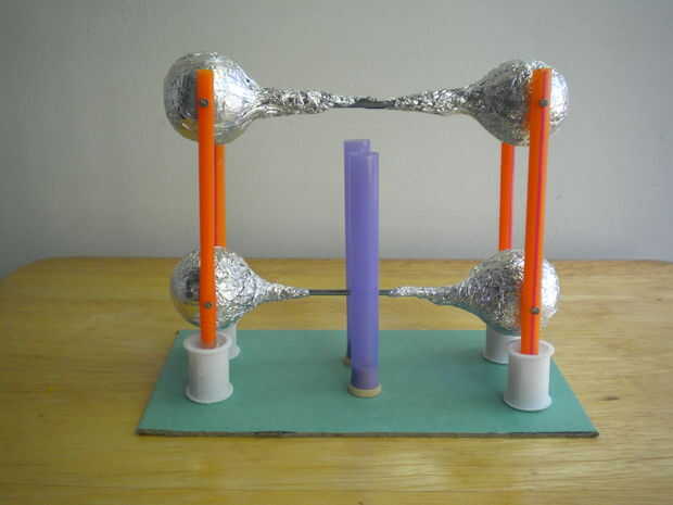 Nota importante: la Asamblea de transporte debe ser equidistante de los electrodos superiores e inferiores de modo que cada esfera de la lanzadera en contacto una esfera inmóvil al mismo tiempo (¡ es embarazoso para decir cuánto tiempo tomó para [casi] lograr este requisito! : > o). Una vez que determinar la altura óptima de transporte y cambiar de posición los electrodos estacionarios según sea necesario, sujete los soportes en posición y marcan la ubicación; Taladre un orificio de 1/16 de pulgada en cada paja para acomodar al eje. Pegamento se monta en la base. Por último, inserte el montaje del eje de transporte entre los montes y el lugar en la cerradura de extremos de eje en ángulo de 90 grados de flexión.