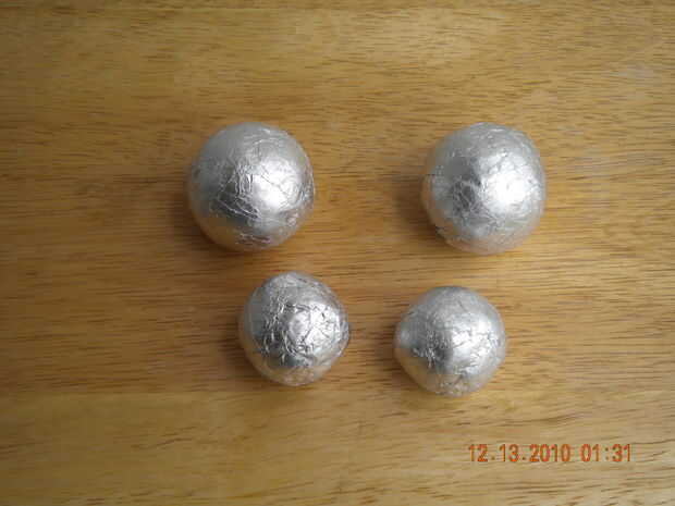 Aquí es el mejor enfoque: cortar un cuadrado grande de papel de aluminio y envolver firmemente alrededor de la esfera y barra el conjunto; no es tan limpio, pero funciona. Además, la hoja mantiene la Asamblea juntos hasta que el pegamento se seca. : >)