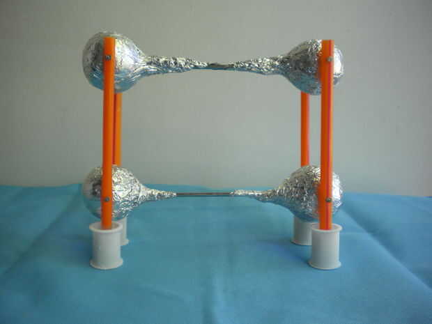 Ahora repita estos electrodo estacionario superior w/los pasos. Ajuste la altura de la paja en los carretes como sea necesario para nivelar la estructura sobre una superficie plana.