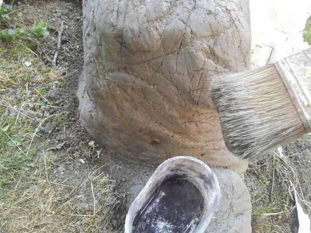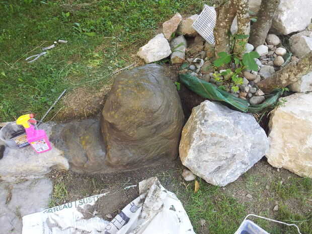 para hacer un rock basura, un saco se cose primero de mallas.  Está lleno de basura y enlucida con cemento.  Las cáscaras que son únicas en forma y un aspecto muy naturales.  Rocas de basura son una forma estéticamente agradable y constructiva para e