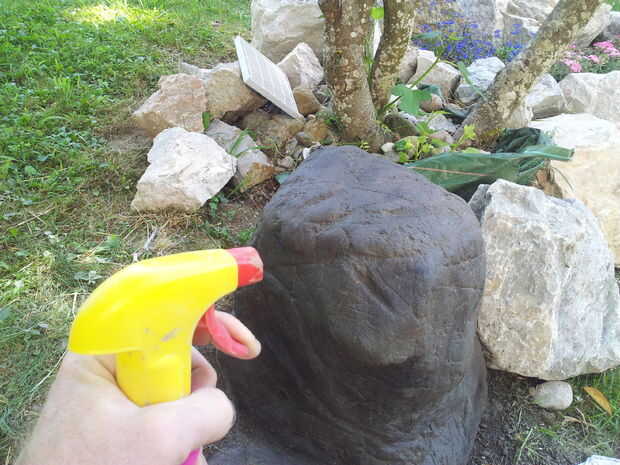 Seco pincel óxidos para obtener primer color general de la roca. Utilizar pulverizadores manuales con óxido amarillo o verde mezclado con agua para dar un efecto de liquen de salpicaduras... este es el último paso como usted no puede trabajar la roca más después. El efecto de liquen de aerosol puede hacerse después de que la roca ha establecido también