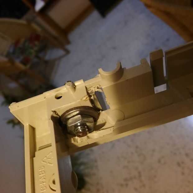 Además se necesita un par de agujeros para fijar la bandeja de dvd en el soporte de 90 grados con el perno, tuercas y una arandela (reformada) modificada. Una vez hecho esto se le pueden comprobar que no exista ninguna interferencia entre la arandela y rieles de la bandeja y si este sería el caso utilizar alguna herramienta rotativa para realizar los cambios en el hardware de la bandeja. Ver las fotos.