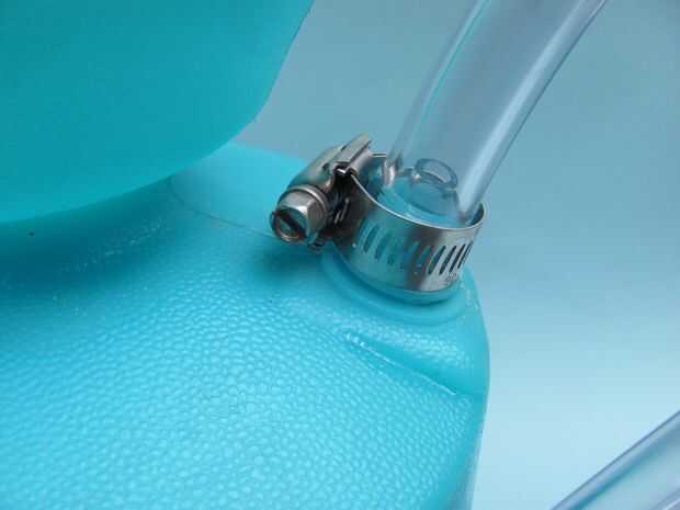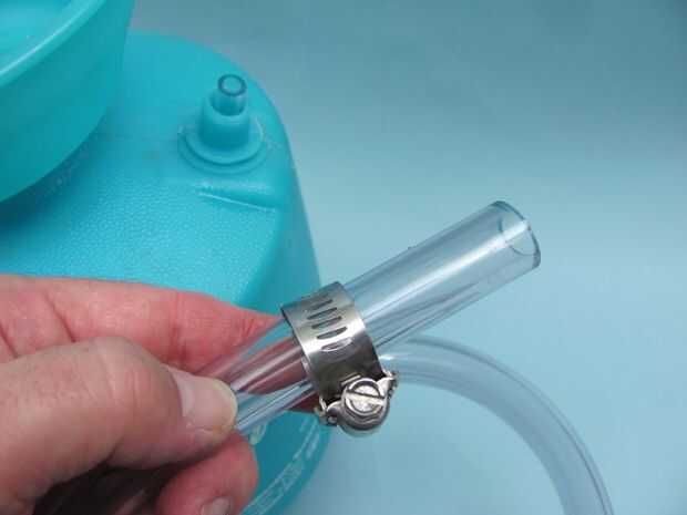 La manguera grande torceduras en la manguera de rosca. Abrazadera de la manguera grande se desliza sobre la manguera y la manguera de conexión y apretó hacia abajo.