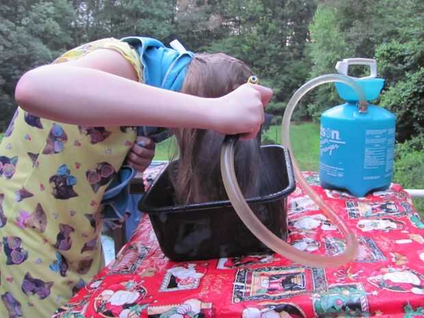Configurar tu salón con su lavabo (fregadero). Consiga su campamento estufa de calor un poco de agua a la temperatura adecuada, y que va viértalo en su modificado 'bug rociador', instalar la bomba, la bomba de aire y a ir con un lavado de cabello fácil.