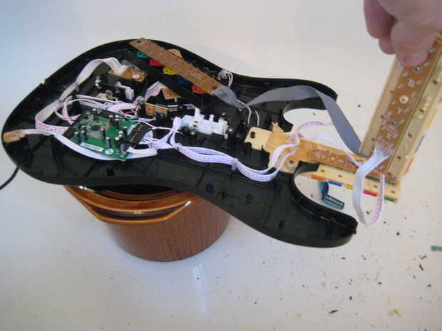 Cuando termine, vuelva a colocar la parte inferior de la parte delantera del cuello en el cuerpo de la guitarra.