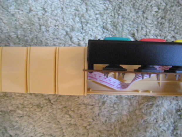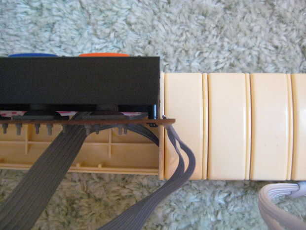 En este punto, puse un poco de pegamento caliente sobre los puntos de soldadura de conector de cable de cinta en el tablero de control de botón de guitar hero. Nos hemos estado moviendo los cables alrededor de un montón, y odiaría para que esos extremos de cable pequeño a romper con el estrés. el pegamento caliente lo tendrá todo en su lugar para nosotros. Esto es opcional.
