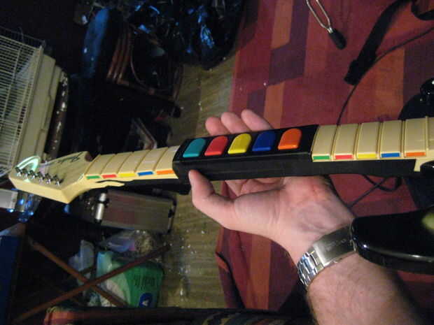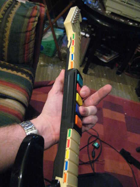 Usar un vendaje apretado de cinta aislante alrededor de los dos extremos de la guitarra héroe botón unidad y conéctelo a la parte posterior del cuello de guitarra de Rock Band.