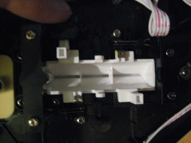 Línea uno para arriba con la pieza de plástico levantada, frente a los contactos reales.