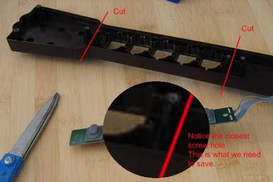 Tienes que cortar justo por encima y justo debajo de los agujeros de tornillo para la platina de botones. Estos orificios serán de vital importancia para la integridad estructural del sistema.