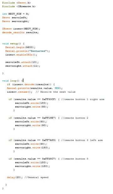 Programé dos servomotores para reaccionar a ciertos botones en un control remoto IR. Estos servomotores potencia más tarde los brazos para el robot.