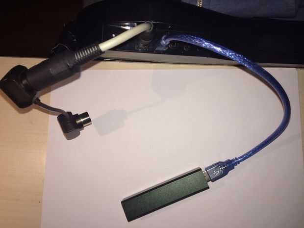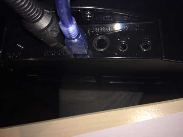 Conectar el Banco de potencia con manguera USB You Rock Guitar para el conector Mini USB. Conecte el cable de MIDI a la salida MIDI la guitarra You Rock Guitar.