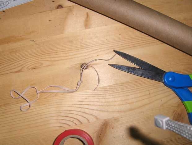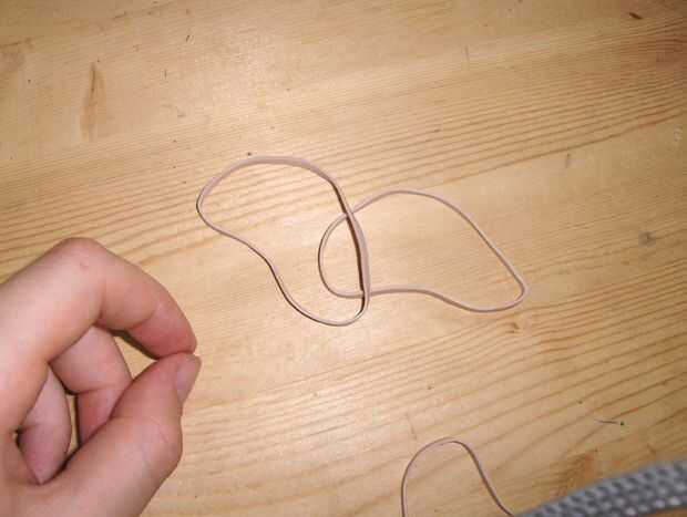 Para conectar los elásticos Coloque un elástico sobre otra (ver foto) Tire uno en la parte inferior por lo que va alrededor de la otra y luego tirando de él a través de sí mismo. Suena duro pero es realmente fácil. Entonces attatch entrada a la cadena con el mismo nudo. Luego cortar uno de los extremo elástico como en la segunda foto. después de que la cinta adhesiva en el extremo del tubo como en la tercera foto.
