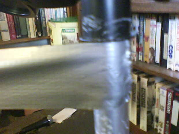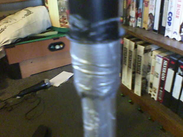 Ahora Desenrolle (no la vicia de) suficiente cinta para agarrar el área donde el soporte agarra (la parte inferior del tambor el ensamblaje de la almohadilla que une las piernas) y línea de la parte superior de la tira con la parte superior de la zona de agarre. Lo pegan hay y rap el rollo alrededor de unas cuantas veces. Más flojo que fue el soporte, más necesita rodar. Rasgue la pieza y donde algunos cuelga de la parte inferior, exprimirlo a la pierna para hacer un cono.