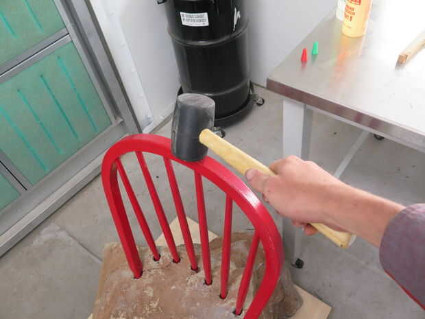 Una vez que haya aplicado suficiente pegamento a toda su línea de agujeros hasta los husos otra vez y un martillo en allí. No seas tímido aquí tampoco. Tener un ajuste muy apretado ahora pagará a largo plazo. Oh, creo que me olvidé de mencionar el martillo de goma en la lista de las herramientas necesarias, lo sentimos todos.