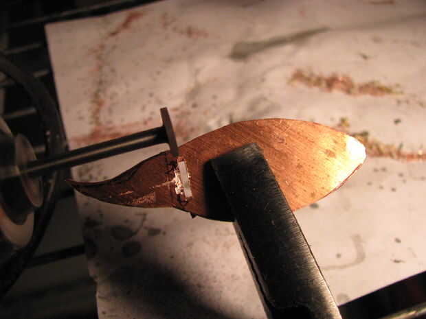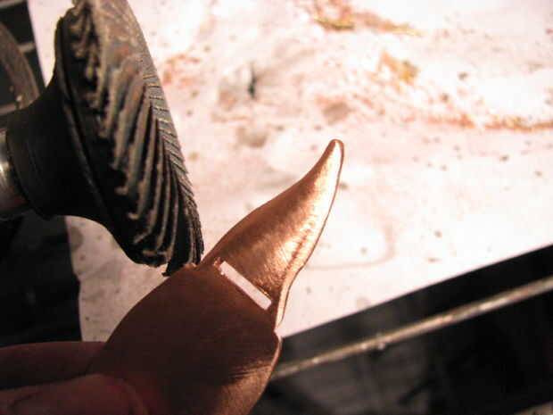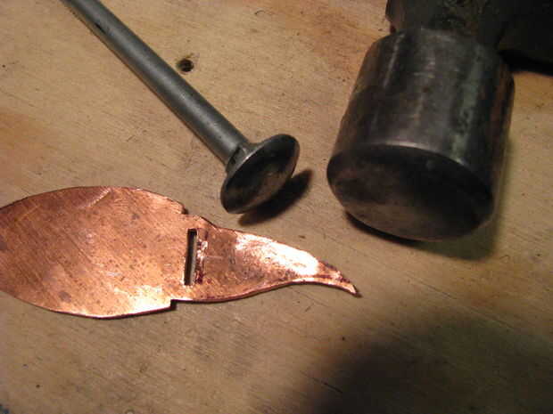Hacer la llama cóncavo con la cabeza de un perno de carruaje y un martillo contra un trozo de madera. Biselar los bordes de la llama con un documento de archivo o de la arena.
