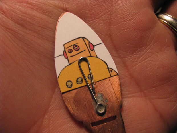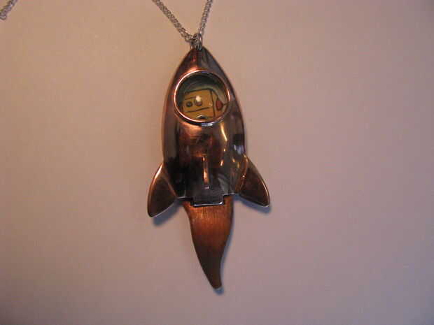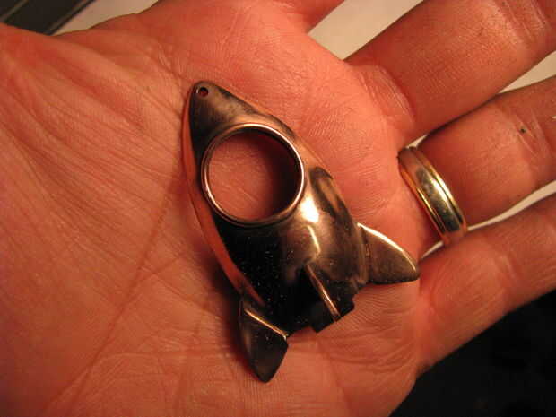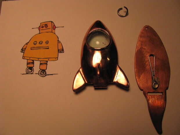 Utilice la parte trasera del cohete para una plantilla. Recorta tu foto y colóquelo en el clip. Fijar la espiga en la parte posterior. Utilice un clip de papel para hacer un anillo del salto. Perfore un agujero en la parte superior del cohete y conéctelo junto con el anillo del salto.