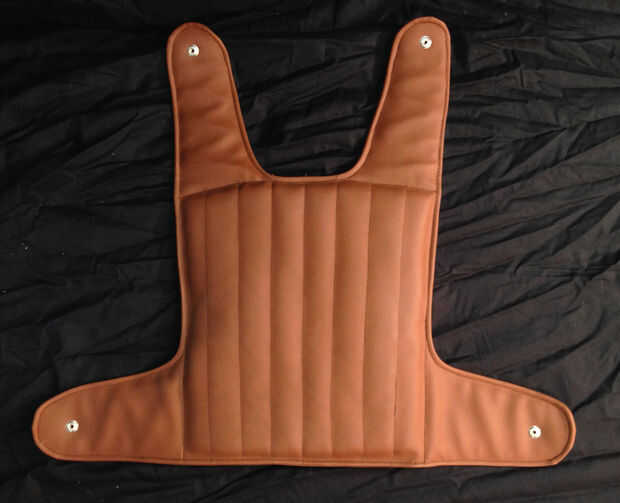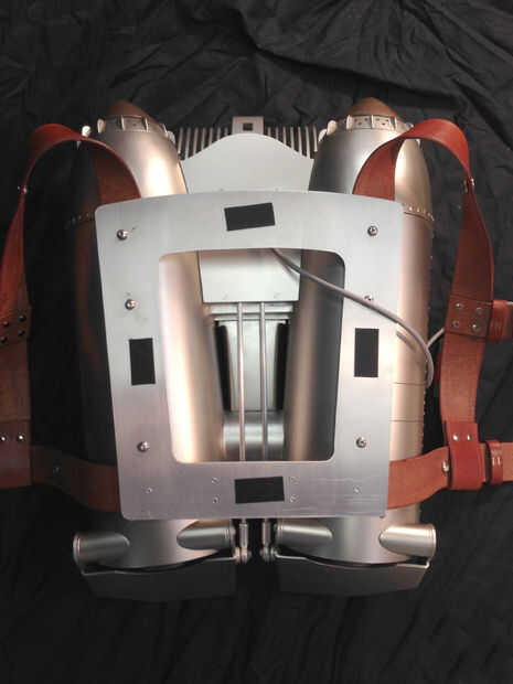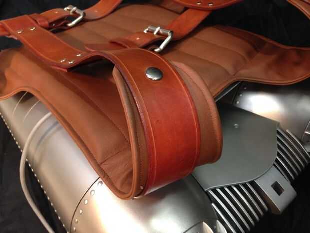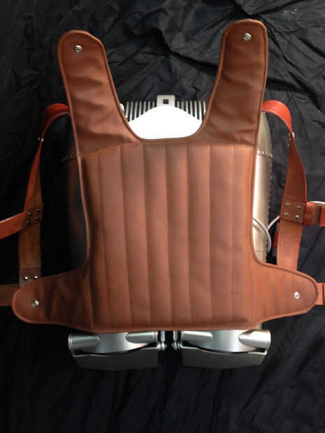 El sistema del arnés comenzó con un subchasis de aluminio que los pernos firmemente al cuerpo del cohete. Corté una serie de 2" las correas de cuero para el sistema del arnés principal. Esto fue clavado juntos en el sistema final. El acolchado forro trasero parece cuero pero es realmente un cuero sintético que se adhiere al bastidor con velcro.