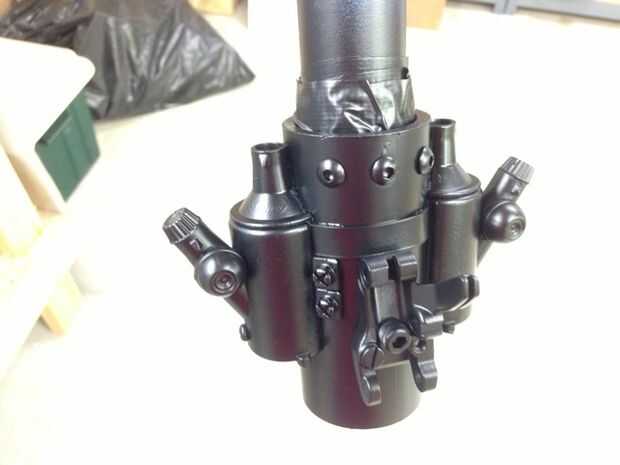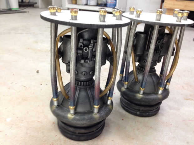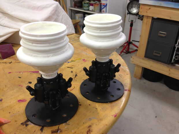 Me rasguño/kit-bashed las porciones superiores de los dos motores de cohete, hechos de varias piezas en mi tienda y de la ferretería. He intentado emparejar el aspecto general y la topología de los cohetes de la pantalla utilizada. Era más barato construir ambos, en lugar de construcción y fundición.