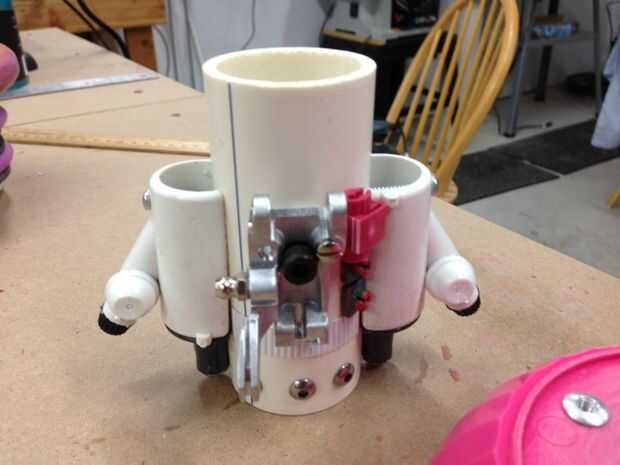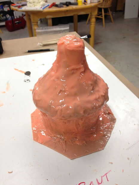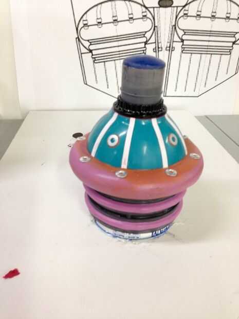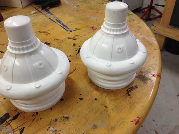 La parte inferior/campana del motor fue construida sobre un recipiente de plástico, un accesorio de drenaje y diversas piezas de adorno. Los anillos fueron agregados con arcilla para imitar el look de los cohetes reales. Esta parte fue luego moldeada en silicona y granizados con resina. Nota: esta es la primera vez he moldeado y fundición de nada. Estoy muy emocionado.