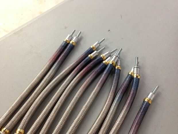 Las líneas de acero inoxidable fueron líneas de agua potable, compradas en la tienda de hardware con conexiones de los extremos. Usé pintura de Duplicilor Metalcast para crear los colores de la distorsión de calor en los extremos.