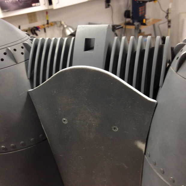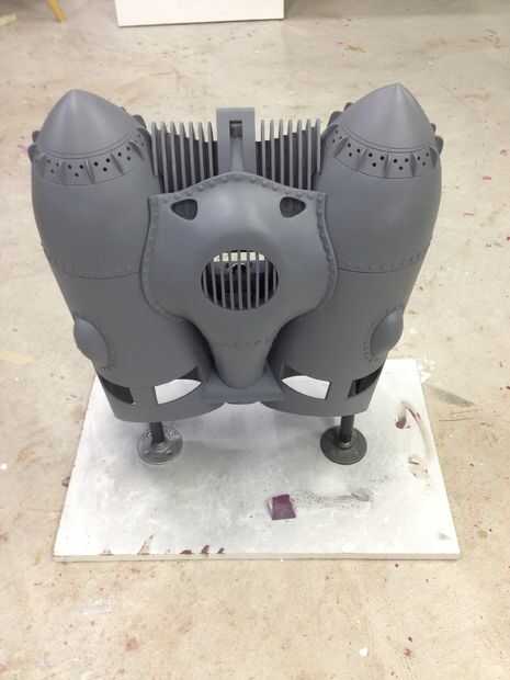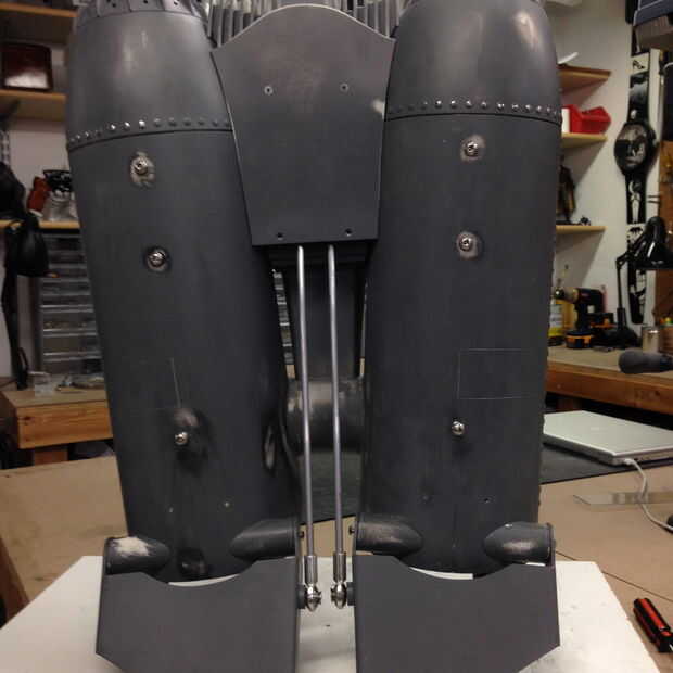 Se agregaron varias partes finales para completar el ensamblado principal. Una serie de pernos se ajustaron a la cubierta principal que más tarde aceptará un sistema de arnés. Un panel posterior fue unido para incluir el interior del paquete – una vez más, extraíble para el mantenimiento del pack. Una serie de varillas y conectores fueron Unidos a las aletas de la parte inferior.