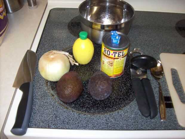 Recoger todos los ingredientes junto con una tabla de cortar, recipiente metálico, trituradora de la patata de tamaño mediano (si no tienes uno que es bien que un tenedor funcionará igual de bien todo lo que puede hacer el aguacate rebanada en pasta.) y un cuchillo.