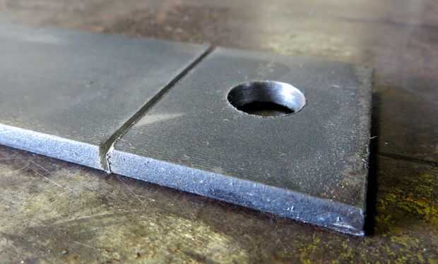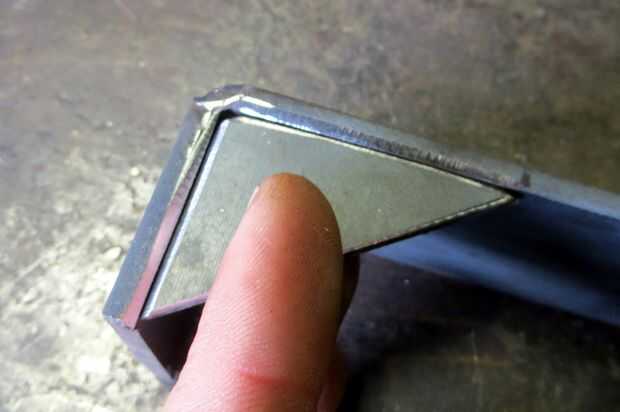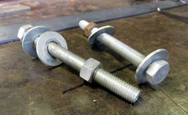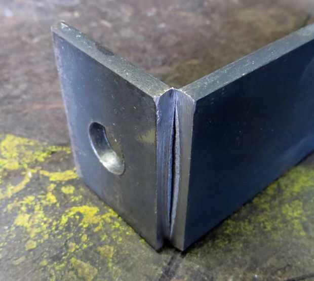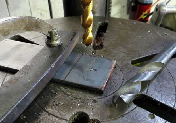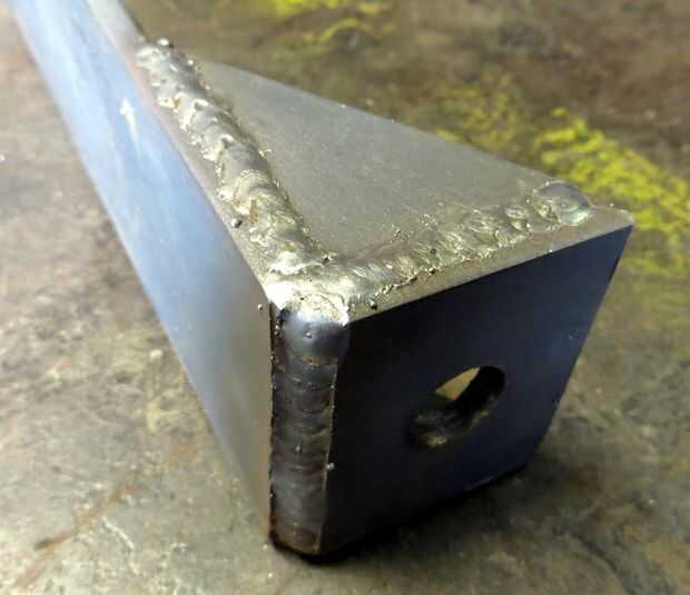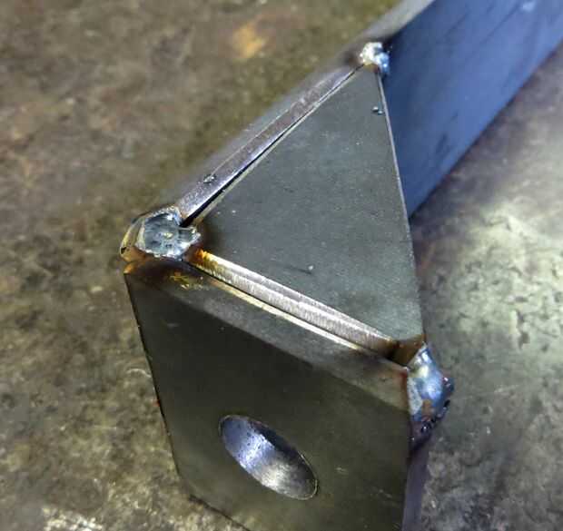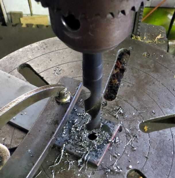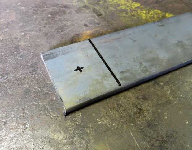 Se ha añadido un extra pulgadas y medio de longitud en cada extremo de la correa que se convierte en un soporte apernado. Taladré agujeros de 1/2" en estos segmentos finales. Luego anotó (con un disco zip) y doblado estas secciones, soldadura en triángulos del mismo material para anclarlas. Ahora tenía una correa con un soporte de unión roscada en ambos extremos.